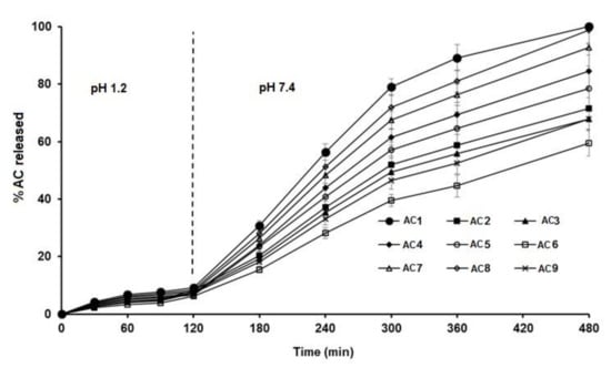 The dissolution studies of the AC pellets were performed in 0.1 N HCl for the first 2 h, then shifted to an alkaline pH of 7.4. The dissolution profile (Figure 4) showed that less than 10% of the drug was released within the first 2 h from all formulations. This behavior could be due to the presence of Eudragit, which starts to be ionized at alkaline pH—at which time the release of the drug started to increase [26]—in addition to the acidic nature of AC, which slows its release at low pH values [26].