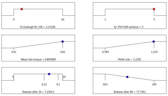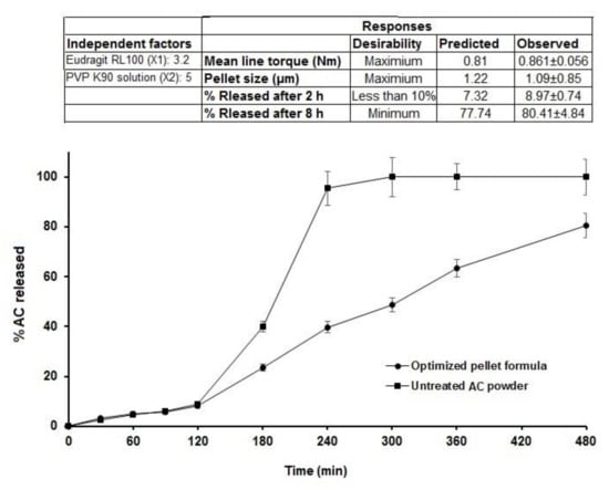 Optimization of AC pellet formulae was established based on the following desirability features: maximum peak torque, maximum pellet size, less than 10% release in the first 2 h (in acidic medium), and minimal release rate after 8 h. A checkpoint of Eudragit RL 100 (X1) = 3.21% and PVP K 90 solution (X2) = 5% was recommended by the statistical program using multiple-response optimization, as shown in Figure 5. The optimized pellet formula was prepared based on the composition suggested by the statistical software, and 0.8 mL of 5% PVP solution/g solid was used as the binder ratio, as obtained from the MTR measurement. The observed values for the attributes (responses) of the sustained-release optimized pellet formula were matched to the predicted responses, and the results revealed a good correlation with the software model’s predicted response values (Figure 6). The optimized pellet formula showed a peak torque of 0.861 ± 0.06 Nm (observed) compared to the predicted value (0.81 Nm), and the observed pellet size was 1090 ± 85 µm, which was narrowly interrelated with the predicted value (1220 µm). In addition, the percentages of drug release in the acidic pH in the first 2 h, and after a further 6 h (at pH 7.4), were 8.97 ± 0.74% and 80.41 ± 4.84%, respectively, showing high correlation with the predicted values (7.32% and 77.74%, respectively).