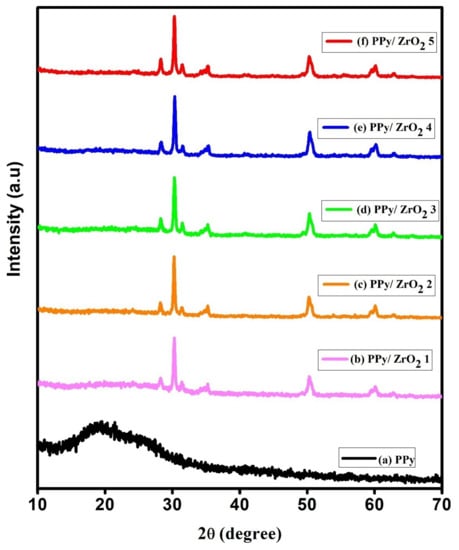 - Irfan, M.; Shakoor, A.; Majid, A.; Hassam, N.; Ahmed, N. Study of Structural, Thermal and Dielectric Modulus of PPy–DBSA–Zirconium Oxide Composites. Russ. J. Phys. Chem. B 2019, 13, 1057–1063. [Google Scholar] [CrossRef]