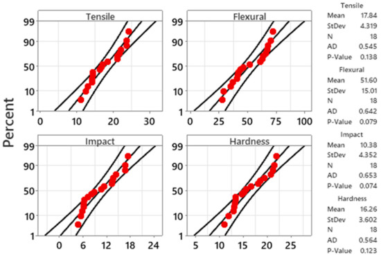 The dispersal of experimental data for each response variable was examined considering the probability plots. The plots were constructed for each response variable at a 95% confidence interval, as shown in Figure 6. The results highlighted the data points for all measured values that fall near the fitted line, so it signifies that the results followed a normal distribution. However, a statistical test, namely Anderson–Darling (AD), is performed to further validate the normal distribution assumption of data. The p-value of the AD test greater than 0.05 represents a normal distribution of the input data. From the result, being the AD test value for each response, the p-value was observed greater than 0.05, which explains that the composed data follow the normal distribution and are suitable for optimization and further analysis.
