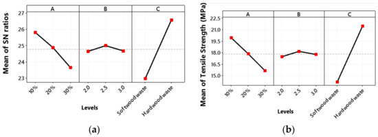 The main plot for the S/N ratio for under tensile loading (the larger the better) is shown in Figure 7a. The greater the value of the S/N ratio corresponds to the better the quality. The optimal combination of design parameters is the wood waste type percentage at low level, i.e., 10%, weight percentage ratio of epoxy, the hardener is at medium level i.e., 2.5, while the wood waste type is hard wood waste. Kumar et al. [35] also obtained the highest S/N ratio of the tensile load at 10% of wood waste.