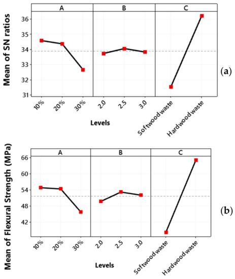 The main effect plot for flexural strength (Figure 8b) shows the tensile strength decreases with an increase in the wood waste type percentage from a low level 1 (10%) to a high level 3 (30%). A high content of wood powder causes aggregation at various regions in the composite that result in weak bonding. Therefore, it produces cracks during flexural tests and reduces the load-bearing capability of composite [52,53]. The incapability of buttressing of wood powder to sustain the stresses transferred from polymer matrix and wood powder bonding create spaces between matrix materials and buttressing and results in a weak structure [54,55]. However, with an increase in the weight percentage ratio of epoxy and hardener, the flexural strength increases slightly from a low level 1 (2) to medium level (2.5). This decreases with an increase in weight percentage ratio of epoxy from medium level to a higher level of 3 (3).