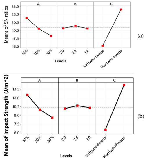 The main effect plot for means of impact strength is shown in Figure 9b. It shows that the highest impact strength is observed for hard wood waste. Further, tensile strength decreases with an increase in the wood waste type percentage from low level (10%) to a high level (30%). This may be attributed to molecular flexibility of polymer that plays a key role in determining the relative toughness and brittleness of composites [48]. The other possible reason is the formation of micro spaces at the fiber–matrix interface with an increase in wood powder that induces the crack propagation in the structure [56,57]. An increase in poor interfacial wetting decreases the impact strength of wood powder-based composites. The increase in wood ash quantity causes a brittle fracture in composite with less impact energy [48]. With the increase in weight percentage ratio of epoxy and hardener, the impact strength first increases slightly from a low level (1) and then jumps up to a medium level of 2.