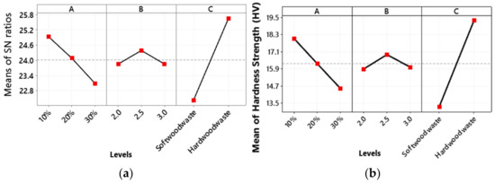 The main effect plot for flexural strength means in Figure 10b shows that the hardness decreases with an increase in the wood waste type percentage from a low level 1 (i.e., 10%) to a high level 3 (i.e., 30%). This is attributed to a decrease in epoxy resin percentage that binds the composite firmly [48]. An increase in wood powder makes the composite structure porous and therefore reduces the hardness of material [57]. With an increase in the weight percentage ratio of epoxy and hardener, the hardness first increases slightly from a low level 1 to a medium level 2, and then decreases with an increase in weight percentage ratio of epoxy from a medium level to a high level 3. The maximum hardness is observed for hard wood waste.