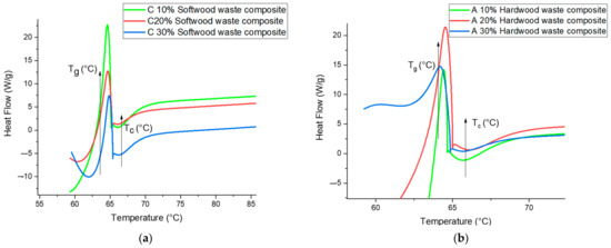 (a) Glass transition temperature (Tg) and crystallization temperature TC of softwood waste filled in composite. (b) Glass transition temperature Tg and crystallization temperature TC of hardwood waste filled in composite.