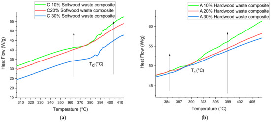 (a) Decomposition temperature Td of softwood waste filled in composite. (b) Decomposition temperature Td of hardwood waste filled in composite.
