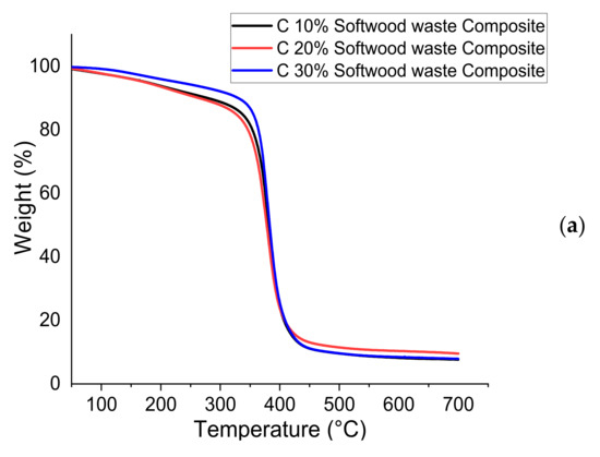 The thermal degradation of the hardwood and softwood waste epoxy composite was determined based on TGA temperature profiles corresponding to 5%, 10%, and 50% weight. The largest temperature value was recorded on hardwood waste A 10% and softwood waste composite C 30%. Regardless of the wood waste type and quantity of wood waste, the temperature of 5% weight loss was more than 150 °C, which is higher than the predictable temperature of the utilization of epoxy composites. Additionally, it was analyzed that the material shows maximum thermal stability in the temperature range around 300 °C. The higher temperature values were obtained for the C 10%, C 20%, and A 20% among the epoxy composites. Hence, the degradation characteristics of different lignocellulosic fibers are possibly assessed based on their chemical composition. Therefore, it is credible that alterations in thermal stability of composite samples from different wood species can be attributed to dissimilarities and variations in the chemical composition of timber components and additionally, can also affect the thermal performance wood polymer composites [68].