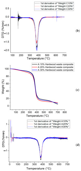 Figure 12a,b demonstrate the decomposition temperature Td for both wood waste types composites. The Td of hardwood and softwood waste composite was around 380 to 400 °C. The previous studies indicate that pure epoxy and bamboo epoxy composite exhibit dissimilar Td [36]. The bamboo fiber composite and epoxy composite exhibited exothermic peaks at temperatures 327 °C to 354 °C. Hence, the addition of hardwood waste at A 10% improves the Td, due to its strong adhesion between matrix and waste. However, the other samples C 10%, C 20%, C 30%, A 20%, and A 30% slightly improved the value of Td.