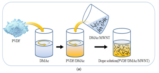 - Preparation of the dope solution. CNT, PVDF, and DMAc were dispersed in the molten state. Figure 1a shows the procedure for preparing the dope solution. Briefly, PVDF powder was added to a solution of DMAc in a 1:3 ratio, and the PVDF/DMAc solution was stirred for 30 min using a centrifugal stirrer. Subsequently, the PVDF/DMAc solution was added to a previously made DMAc/CNT (3 wt%) solution in a 1:4 ratio and stirred for 30 min or more using a centrifugal stirrer, thus yielding the dope solution. The composition of the final dope solution was MWNT:PVDF:DMAc = 0.6:20:79.4.