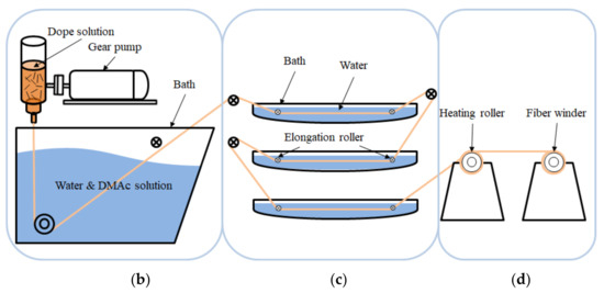- Preparation of washing and drawing baths. Figure 1c shows the stretching of the fibers and the removal of the DMAc remaining in the dope solution, which is used to improve the orientation of the CNTs and the mechanical properties of the fibers. The bath contained water at the same temperature as the coagulation bath, and a roller was submerged in water to transfer the fibers. Then, the fibers were stretched by controlling the rotational speed of the roller.