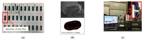 The second method is tensile testing, which reveals the mechanical properties of the CNT/PVDF fibers. These tests were carried out in compliance with the ASTM D3379 standard [18]. As shown in Figure 2a, to prepare tensile specimens of the CNT/PVDF fibers, both ends of a fiber were fixed to a paper guide with an adhesive considering a gauge length of 25 mm. To calculate the tensile strength, the cross-sectional area of the fiber used in the tensile tests was measured using image analysis of the SEM micrographs (Figure 2b) [19]. Image J [20] was used for this image analysis. The actual area of the fiber was calculated based on the area colored in black in Figure 2b, which excludes blank spaces and voids, which are colored in white and red, respectively. The tensile strength of the CNT/PVDF fibers was assessed using a universal testing machine (UTM, ST-1000, SALT Co., Ltd., Incheon, Korea) (Figure 2c) at a draw rate of 2 mm/min under atmospheric conditions at room temperature.