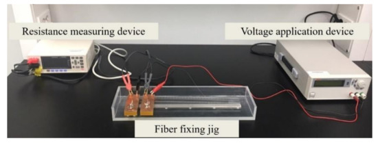 The last method involves the measurement of the electrical conductivity of the CNT/PVDF fibers. For these tests, a four-point probe offsetting the surface resistance is generally used [21,22]. However, in this study, a fiber resistance measurement system minimizing the contact resistance was used, as shown in Figure 3, which allowed us to consider conditions under which no voltage was applied, as used in industrial fields. The system consists of a resistance measurement instrument (RM3544, HIOKI) for measuring the micro-resistance, a voltage application device (OPE-305, ODA Technologies, Incheon, Korean), and a jig to fix the fibers depending on their length. The tests followed the IEC 60,093 standard [23] for determining electrical conductivity data. After mounting a fiber on the fixing jig at a gauge length of 1 cm under atmospheric conditions at room temperature, a potential of 10 V was applied for 10 s, and the resistance was measured with the voltage shut off. Then, the calculated resistance was converted to electrical conductivity.