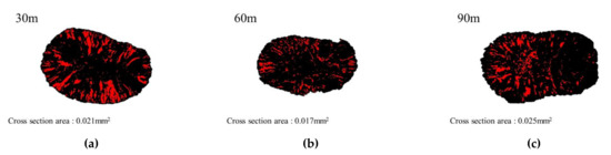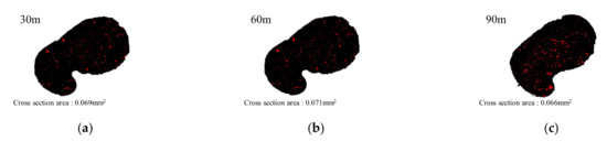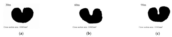 Fist, SEM images of the 30, 60, and 90 m fiber sections for Cases 1 and 2 in Table 2 were analyzed (Figure 8 and Figure 9) to calculate the cross-sectional area of the spinning fiber and evaluate their structures. Table 2 shows the cross-sectional results for Cases 1–8. The cross-sectional areas of the CNT/PVDF fibers showed little variability, as shown by the coefficients of variation (COV) of the 30, 60, and 90 m sections of 0.011–0.074. Therefore, it was confirmed that the additional post-treatment processes increased the manufacturing stability of the CNT/PVDF fibers.