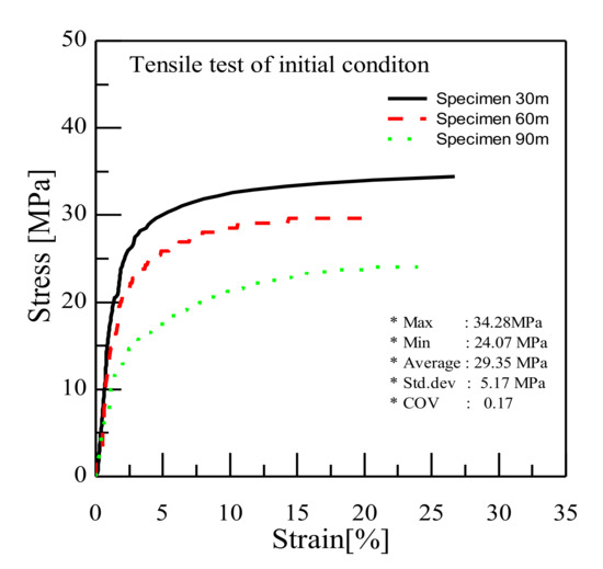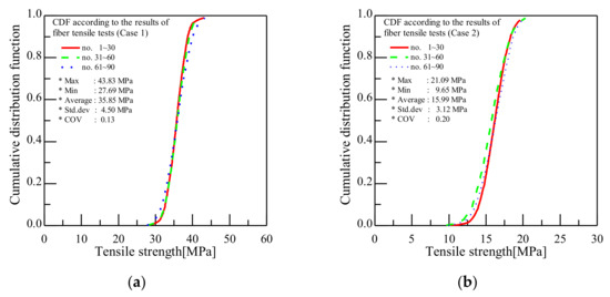 Next, we examined the mechanical properties of the fibers in all sections. For this, 30 specimens were sampled at 30, 60, and 90 m and subjected to tensile tests. Table 3 and Table 4 show the tensile strength results obtained after a total of 90 tensile tests of samples prepared using the conditions labeled Cases 1 and 2 in Table 1. The tensile strength COV indicates little variation, ranging from 0.11 to 0.14 for Case 1 and from 0.19 to 0.21 for Case 2. Table 5 summarizes the tensile test results of the fibers with respect to the selected process parameters. Although the magnitude of the COV varied between cases, the COVs for the different sampled sections (30, 60, and 90 m) remained constant for Cases 1–8. These results confirm the continuity of the mechanical properties along the fiber length and suggest that the bath concentration, bath temperature, drying temperature, and elongation affect the tensile strength. In addition, the tensile test results of Cases 1 and 2 are expressed as cumulative distribution functions (CDFs). Figure 10a shows the CDF diagram for Case 1, which has a COV of 0.13, confirming that the tensile strengths in all tested sections are constant. Figure 10b shows the CDF diagram for Case 2. Although the tensile strength was found to vary with 9.65 MPa in specimens 31–60, the COV was only 0.20, indicating that the trend in the CDF diagram was constant. Thus, the three CDF diagrams, which represent the average tensile strength of the 30 specimens from each of the 30, 60, and 90 m sections of the fibers, mostly overlapped, indicating minimal variation in the tensile strength in the tested sections of the fibers.
