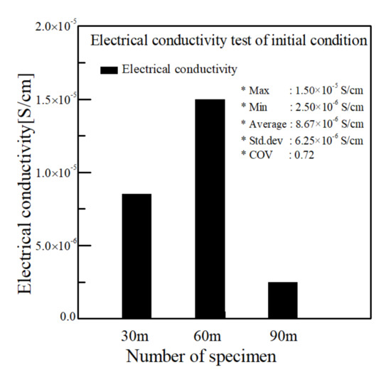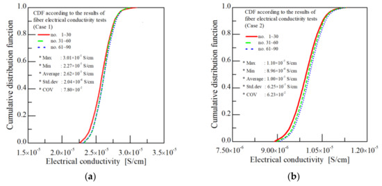 Next, the consistency in the electrical properties of the CNT/PVDF fiber in the longitudinal direction was analyzed, and, as before, 30 specimens were sampled from the 30, 60, and 90 m sections. Table 6 and Table 7 show the corresponding results for Cases 1 and 2 (see Table 1). The electrical conductivity COV values for the 30, 60, and 90 m sections for Cases 1 and 2 ranged from 7.41 × 10−2 to 8.23 × 10−2 and 5.55 × 10−2 to 7.03 × 10−2, respectively, indicating little variation. Table 8 summarizes the electrical conductivity results for the fiber depending on the selected process parameters. Although the magnitude of the COV varied between cases, the COV remained constant for all sections for Cases 1–8. These results confirm that the electrical properties of the fibers were consistent along the fiber length, and also suggest that the bath concentration, bath temperature, drying temperature, and elongation affect the electrical conductivity. As for the tensile tests, the electrical conductivities of the fibers prepared using the conditions in Cases 1 and 2 in Table 1 are expressed as CDFs in Figure 11. As shown in Figure 11a, the three CDF diagrams for Case 1, which represent the average of the 30 electrical conductivity measurements, mostly overlap, indicating minimal variance in electrical conductivity across the sections of the fiber.