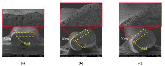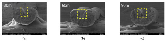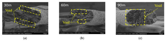 In addition, the variation in the cross-sectional shape of the CNT/PVDF fibers was analyzed using SEM. Figure 12 and Figure 13 show the SEM images of the cross-sections of the 30, 60, and 90 m sections for Cases 1 and 2. The SEM image for Case 1 in Figure 12 confirms a constant shape in each section, whereas that for Case 2 in Figure 13 demonstrates that the voids were constant throughout each fiber section.
