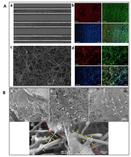 (A) SEM and fluorescent microscopy images of human NSC-derived neurons cells on pyrolyzed aligned SU-8 (a,b) and PAN fibres (c,d). Reproduced with permission from Ref. [90]; copyright (2020), Elsevier. (B) SEM images of ADSC adhesion on (A) PLGA, (B) MWCNT, and (C) SWCNT scaffolds. Magnification images of ADSCs on MWCNT scaffolds show cytoplasmic extensions (yellow arrows) attached to the nanotube (D,E). Red arrows indicate cell body. Reproduced with permission from Ref. [98]; copyright (2017), John Wiley and Sons.