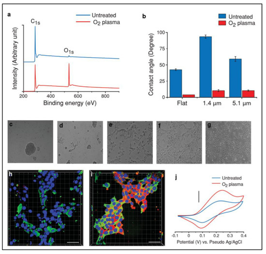 XPS characteristics of flat carbon before and after oxygen plasma treatment (a). Contact angle measurements on flat carbon and p3D-carbon (b). (c–g) Representative bright field images of hNSCs cultured in the presence of growth factors (48 h) on (c) untreated, (d) oxygen plasma-treated, (e) PLL-coated, (f) oxygen plasma-treated and PLL-coated flat carbon surfaces, and (g) PLL-coated TCPS. (h,i) Representative confocal fluorescence images of human NSCs cultured in the presence of GF (48 h) on (h) PLL-coated TCPS and (i) oxygen plasma-treated and PLL-coated flat carbon surfaces. Characteristic cyclic voltammograms of dopamine (5 mM) in PBS (pH 7) on a p3D-carbon before and after oxygen plasma treatment (j). Reproduced with permission from Ref. [81]; copyright (2014), John Wiley and Sons.