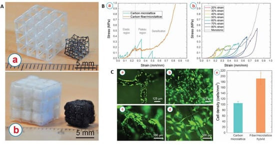 (A) (a) Additively manufactured microlattice architectures before (left) and after (right) carbonisation. (b) Cotton/microlattice hybrid architectures before (left) and after (right) carbonisation. (B) (a) Stress–strain curve of the carbon microlattice, and the carbon fiber/microlattice hybrid architecture. (b) Cycling loading of the carbon fiber/microlattice hybrid architecture with a sequential increment of strain. (C) Osteoblast-like murine MC3T3-E1 cells cultured on (a) carbon microlattice architectures and within (b–d) carbon fiber/microlattice hybrid architecture. (c) Proliferation of the cells along the carbon fibers and (d) shows the inter cellular network within the inner pores created by the carbon fibers. Some cells appear out of focus due to the presence of cells growing on different planes of the 3D scaffolds. (e) Comparison of the density of the cells colonised on the carbon microlattice architecture and within the carbon fiber/microlattice hybrid architecture. Reproduced with permission from Ref. [125]; copyright (2021), Elsevier.