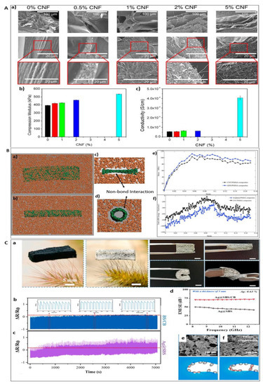 (A) SEM images of lyophilised hydrogels with different CNF content (a) (Top row scale bar 100 μm, middle and bottom row 20 μm); (b) Young’s modulus and (c) electrical conductivity of the samples of alginate/gelatin/CNFs hydrogels as a function of the CNFs content, respectively. Reproduced with permission from Ref. [124]; copyright (2021), Elsevier. (B) Molecular models of the: (a) CNT/PMMA composites, (b) GNS/PMMA composites, (c) and (d) cross section views of the interfacial interactions between the nano-reinforcements and PMMA matrices. The PMMA matrices and nano-reinforcements are presented by the colors of orange and green, respectively. (e) The strain–stress curves of the CNT, GNS/PMMA composites. (f) Total vdW energy of the CNTs, GNS/PMMA composites during the tensile processes. Reproduced with permission from Ref. [130]; copyright (2018), Elsevier. (C) (a) Optical image of SBS/CB frame, Ag@SBS/CB hybrid foam, and optical images of the Ag@SBS/CB hybrid foam under compression, bending and twisting. The scalar bar is 5 mm. Cyclic compression-release test of Ag@SBS/CB (b) and Ag@SBS foam (c). (d) EMI SE comparison of Ag@SBS/CB and Ag@SBS foam. (e,f) SEM images and corresponding schematics of Ag@SBS/CB under pristine and compression state. Reproduced with permission from Ref. [131]; copyright (2021), Elsevier.