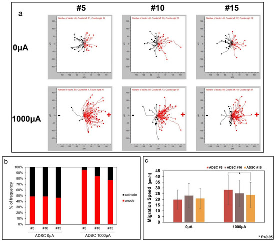 ADSCs migration by electrotaxis with increasing passage numbers. Reproduced with permission from Ref. [99]; copyright (2019), Elsevier. (a) ADSCs were manually tracked and cells migration was divided into the right (anode) and left (cathode). (b) Frequency of cell movement towards the anode and cathode. (c) Cell migration speed was measured at passages 5, 10, and 15 when direct current was applied to the cells. * p < 0.05.
