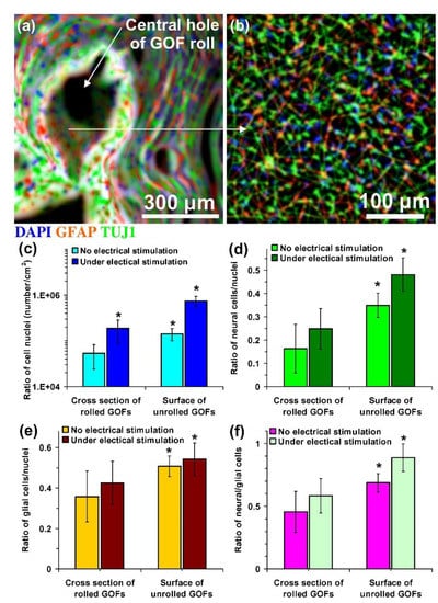 Fluorescent images of hNSCs differentiated on (a) cross-section and (b) interior surface of a rolled-GOF scaffold after two weeks of electrical stimulation. The nuclei, glial, and neural cells of the differentiated cells were stained by DAPI (blue colour), GFAP (red colour), and TUJ1 (green colour), respectively. (c) The number of cell nuclei per surface area of the images and ratio of the number of (d) glial cells (GFAP-positive cells) and (e) neural cells (TUJ1-positive cells) to the number of nuclei and (f) neural/glial cell ratios on cross-section and interior surface of the scaffolds after two weeks differentiation in the absence and the presence of electrical stimulation. Significant results are indicated by asterisks (*) for p-values < 0.05 (n = 5). Reproduced with permission from Ref. [138]; copyright (2016), Elsevier.