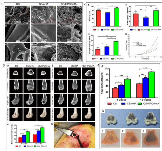 Moreover, Dai et al. developed a 3D chitosan/honeycomb porous carbon/hydroxyapatite (CS/HPC/nHA) for bone tissue engineering (Figure 9). They showed that the addition of HPC improved the swelling abilities and mechanical properties of the scaffold. The resulting scaffold also promotes the growth, proliferation, viability, and osteogenic differentiation of mouse BMSCs. Meanwhile, the in vivo study of the scaffold has significantly promoted bone regeneration on distal femoral condyle defects of the rabbit model [170].