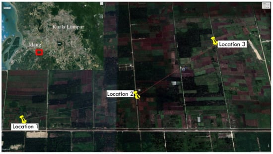 Peat soil samples in this study were acquired from three different locations approximately 1 km apart in Johan Setia village, Klang city, located about 40 km away from Kuala Lumpur, as shown in Figure 1. The primary geotechnical properties of in-situ (untreated) peat soil are displayed in Table 1. The soil samples were obtained at depths between 0.5 and 1 m below the existing ground surface. It should be noted that the groundwater level was found to be about 0.4 m below the existing ground surface. This accounts for the high moisture content found in the peat soil samples. The physical appearance of peat soil revealed that it was fully saturated and had very dark brown coloration. Peat soil sampler was implemented in this study to determine the physical and chemical properties of peat soil. The sampler was used in a previous study by Zulkifley et al. [18]. The sampler mainly consists of a movable chamber that prevents the occurrence of disturbances, an anchored fin and a movable sampling chamber. Samples were collected using hand augers and were then oven-dried at 60 °C until a constant weight was observed (average duration of 48 h). The oven-dried samples were then stored in plastic bags after they reached room temperature.