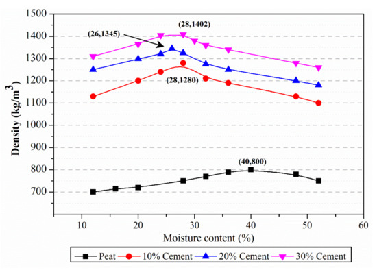 The results of OMC for the corresponding MDD for both the untreated and cement-treated peat soil are depicted in Figure 4. The results show that the untreated peat soil attained an MDD of 800 kg/m3 when 40% moisture was utilized. One possible reason for such a high OMC is due to the presence of large voids, as organic contents and water are absorbed to fill up the large voids. This is in line with Zulkifley et al.’s description of peat soil having rather low bulk density and high water content due to the presence of high organic contents, such as branches, trunks, roots, leaves and fruits. This is also substantiated by literature showing a similar bulk density range of 800–1000 kg/m3 in West Malaysian peat [20].