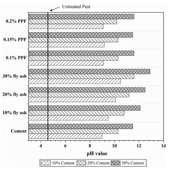 pH tests were conducted to determine the pH values of treated and untreated peat soil. The results are presented in Figure 5. The average pH value of untreated peat soil was found to be 4.5, indicating the acidic nature of peat soil. This value corresponds to the previously measured pH value of around 3.76 for local peat soil obtained from different Malaysian states [21]. The low pH value of peat soil is due to the presence of high amounts of decomposed plant fragments (organic), which influence the chemical and biological properties of peat soil [22].