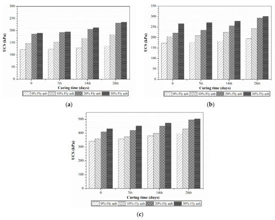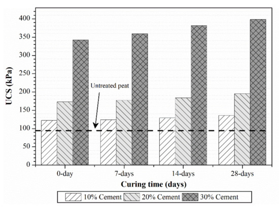 UCS test results for each proportion of cement content are presented in Figure 7. The UCS of cement-treated peat soil was found to increase with the curing period. This could be attributed to the additional hydration reactions that occur during curing [28], which in turn would have enhanced the strength characteristics of cement-treated peat soil. It was also observed that at all ages, higher UCS was attained by cement-treated peat soil as the cement content in the specimens was increased. For instance, the addition of 20% of cement resulted in about 30% higher UCS when compared to the 10% addition of cement for 7-day, 14-day and 28-day specimens. Likewise, when the cement dosage was increased up to 30%, the UCS increased by around 50% when compared to the UCS of the specimen treated with 20% cement. A similar observation was reported by Kalantari et al. [29].