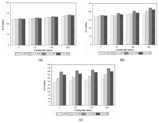 UCS of treated peat with (a) 10% cement and 0–0.2% PPF, (b) 20% cement and 0–0.2% PPF and (c) 30% cement and 0–0.2% PPF and different curing durations.