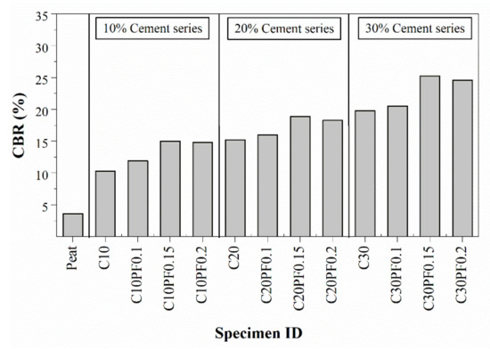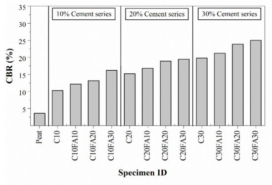 A positive correlation was observed between the CBR value and the amount of fly ash added to soil with all cement percentages, as can be seen in Figure 10. On average, the addition of 10% and 20% of fly ash to cement-treated peat soils gave about 12% and 24% higher CBR values when compared to the corresponding cement-treated peat soils (for all cement series). As an example, C20FA10 treated peat soil exhibited a CBR of 16.8%, whereas C20 (containing only 20% cement) produced a CBR of 15.2%. The largest improvement in CBR values (37% on average) was observed when 30% of fly ash was added to cement-treated peat soil. These observations are in line with UCS results, as the strength of treated peat soil samples improved with cement and fly ash contents.