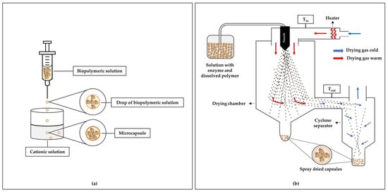 | Spray drying | β-galactosidase | Chitosan | Encapsulation increased the diffusional effect of the released enzyme and reduced the initial activity of the enzyme. | [157] |