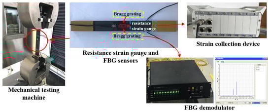 The diameter of the FBG sensors (procured from Yuguang Inc., Hangzhou, China) was 125 μm. One resistance strain gauge was welded to the centre of the tensile specimen along the tensile direction. Two FBG sensors were pasted on the specimen parallel to the strain gauge, as shown in Figure 2. The drawing speed during tensile testing was 2 mm/min.
