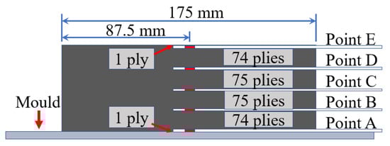 The temperature sensitivity constant was estimated through the experiment. The material used in this work was the plain-woven AF/EP prepreg (procured from AVIC Composite Corporation LTD, Beijing, China). The size of the [0]300 thick AF/EP laminate was 175 mm × 80 mm, and it had a thickness of 51 mm (before curing). The thick AF/EP laminate was manufactured using the autoclave process. The autoclave curing cycle recommended by the prepreg manufacturer is as follows: the temperature is raised from 25 °C to 130 °C at a heating rate of 0.5 °C/min and then held constant for 120 min. After holding, the temperature is reduced from 130 °C to room temperature (25 °C) at a rate of 0.3 °C/min. During the entire autoclave process, the pressure was maintained at 6 bar. Five monitoring points (A, B, C, D, and E) in the AF/EP laminate, located along the thickness, were chosen, as shown in Figure 3.