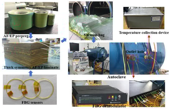 - Wang, Q.; Gao, L.; Wang, X.; Dong, Q.; Wan, G. Numerical analysis and fiber Bragg grating monitoring of thermocuring processes of carbon fiber/epoxy laminates. Polym. Test. 2017, 62, 287–294. [Google Scholar] [CrossRef]