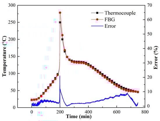 Figure 11 shows the time–temperature curve at point C, as monitored by the thermocouple and FBG. The overshoot temperature monitored by the FBG was 281.16 °C, whereas the temperature monitored by the thermocouple was 251.2 °C. Thus, a temperature difference of 29.96 °C was noted between these readings. As shown in Figure 11, the measurement error of the FBG is less than 5% before the occurrence of the overshoot temperature and 21.16% immediately after the occurrence of the overshoot temperature; the maximum error in the cooling stage is 11.18%. Therefore, the overheating temperature has a significant impact on the accuracy of FBGs. Consequently, it is necessary to control and reduce the overheating temperature. Importantly, this is the first study to show that the overheating temperature during the curing process of composites affects FBG sensor measurements.