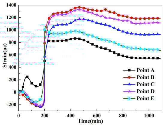 Figure 12 illustrates the strain history of the five points throughout the curing process. This is a complex process influenced by the temperature, curing shrinkage, and mould interaction. Before the gelation of the resin, the strain changes caused by thermal deformation and the resin flow of the prepreg were measured using the FBG sensors. In the initial stage, the trend of the strain at point A was different from those of the strains at the other points; this was likely due to the thermal expansion of the mould. At around 200 min, the strains at all the five points increased rapidly within a very short period. Before the gelation of the resin, thermal expansion and solidification do not result in strains [43]. However, the strain curves increased primarily due to the excessively large thermal expansion caused by the heat from the drastic exothermal reaction and the frictional effect transferred to the FBGs as the viscosity increased. In the thermal insulation platform stage, the resin reacted until it was completely solidified. The curing shrinkage can only be clearly observed in the strain curve for point E. Therefore, the heat of the drastic exothermal reaction was the most important factor affecting the strain of the thick AF/EP composites. In the cooling stage, the strain curves decreased manly due to the reduction in temperature and the transfer of the frictional effect to the FBGs. The minimum curing residual strain at point A, which was affected by the mould, was 537.66 με. The residual strain at point E was 669.10 με due to the direct effect of the atmospheric pressure of 6 bar acting on the outer layer, which limited the strain development during the forming process. The residual strain values at points B, C, and D were 1180.63 με, 925.66 με, and 1114.12 με, respectively. The strain gradient distribution was notably different in the curing process of thick AF/EP composites.