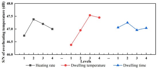 During the curing of the thick AG/EP laminate, the overheating temperature leads to matrix degradation, thermal residual stress, and uneven curing [19]. Hence, a lower overheating temperature was pursued during curing. Table 4 shows the ANOVA of the SNR; the dwelling temperature was found to be the primary factor with a contribution of 75.78%. The contributions of the heating rate and dwelling time were 20.16% and 4.06%, respectively.