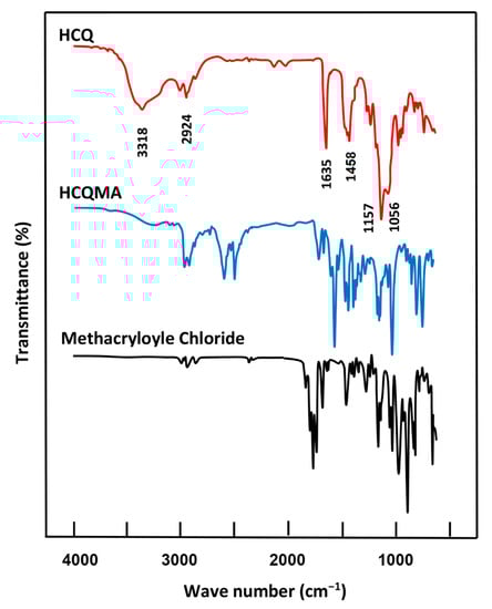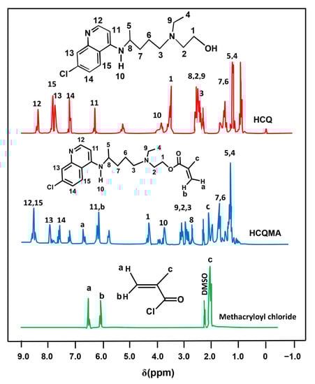 1H NMR spectra of pure HCQ, methacryloyl chloride and CQMA.