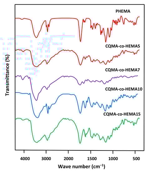 Figure 2 shows the FTIR spectra of the CQMA-co-HEMA copolymer of different compositions. These spectra showed the combination of the absorption bands attributed to the two monomers HEMA and CQMA, except that which characterized the vinyl C=C double bond of the two monomers of average intensity at 1635 cm−1 represented in Figure 1. The bands of absorption attributed to C–Cl stretches and CN bending shown at 1057 and 1157 cm−1 in the CQMA monomer (Figure 1) were covered in the copolymer spectra by the –C–O–C– bands of the HEMA units, which appeared between 1321 and 1032 cm−1 [29].