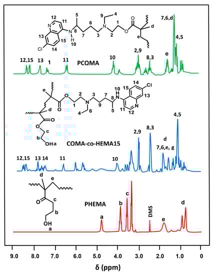 The 1HNMR spectra of CQMA-co-HEMA15, selected among the other copolymers by their higher density in chloroquinyl groups, the PHEMA and PHCQMA homopolymers were grouped in Figure 4. As in the case of the FTIR analysis, the spectra of the copolymers revealed the presence of the combination of all the signals attributed to the two monomeric units, CQMA and HEMA, with the exception of those attributed to the protons (a) and (b) of the vinyl double bonds (sites of the polyaddition reaction), which appeared on the monomers spectra of Figure 3.