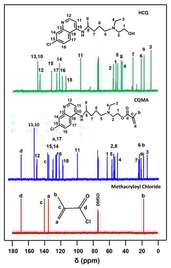 13C NMR spectra of pure HCQ, pure methacryloyl chloride and CQMA in DMSOd6.