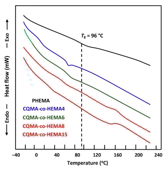 For CQMA-co-HEMA, Figure 8 shows a comparison between the thermograms of the PHEMA homopolymer and those of the copolymers involving CQMA and HEMA monomers with different compositions. As shown in these profiles, PHEMA presented a glass transition temperature, Tg, at 95 °C, which agreed with that of the literature [30], while the thermal curves of the copolymer showed a shift in the Tg towards low temperatures, which increased with the CQMA content. This appeared to be evident due to the effect of the steric hindrance of the chloroquinyl methacrylyl substituent of the CQMA units. Indeed, according to Reimschuessel [31], the more the substituent of the alkyl methacrylyl units in the homopolymer is hindered, the less the values of Tgs are important. The large spacing between the polymer chains caused by this substituent facilitated the sliding of the chains between them, and this reflected the reduction in Tg values. On the other hand, the more the number of these units increase in the copolymer, the less the Tg values.
