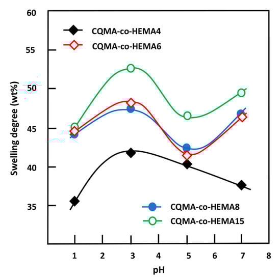 The swelling behavior of any hydrogel is an important key which controls the amount and transfer of drug released from a drug carrier system to a target external medium. The mechanism of the swelling of a polymer gel in a liquid medium mainly involves two important factors, which are the affinity of the polymer–solvent type and the diffusion dynamics of the absorbate in the absorbent material. The affinity of the polymer with respect to the absorbate is governed, mainly, by the difference between their solubility parameters. On the other hand, the diffusion dynamics of the molecules of the absorbate in the absorbent polymer matrix are controlled by various parameters such as the degree of the crosslinking of the polymer [33,34], the temperature [35,36] and the pH of the medium in which the drug is to be released [37,38]. In this work, the swelling degree at the equilibrium (S) of CQMA-co-HEMA films was calculated at different pH media from Equation (3) and the results obtained are plotted in Figure 11.