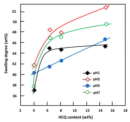 Figure 12 shows the change in the swelling capacity of the CQMA-co-HEMA copolymer at equilibrium as a function of the CQMA content. These curve profiles revealed a linear dependence of the swelling capacity for the copolymer with the CQMA content in pH medium 5 and logarithmic in pH 1, 3 and 7. As can also be seen from these data, in any pH medium investigated, the swelling rate of copolymers increased quickly when the CQMA content in the copolymer ranged between 4.70 and 7.22 wt%, while an increased linearly in pH medium 5 in all the investigated composition ranges was seen. The increase in the swelling capacity of the copolymer with the CQMA content could be explained by two main factors: (i) the increase in the solvation of the chloroquinyl methacrylate substituent through the protonation of the amine group which occurred in acidic media and (ii) the increase in the density of the hydrogen bonds between the hydroxyl of water and that of the HEMA unit through an increase in the free volume between the copolymer chains created by the bulky chloroquinyl methacrylate substituent. At a certain limit of the CQMA content, the hydrophobic character of the ester substituent intervened by limiting the solvation of the copolymer, which reflected the slowing down of the swelling capacity of copolymers containing more than 7.22 wt% in the CQMA unit, notably in pH medium 1, in which a plateau was obtained resulting from a pseudo-equilibrium between a decrease in the hydrophilicity of the copolymer due to the formation of ester (chloroquinyl methacrylate) and, simultaneously, an increase in the solvation of HCQ due to the protonation of its amine groups.