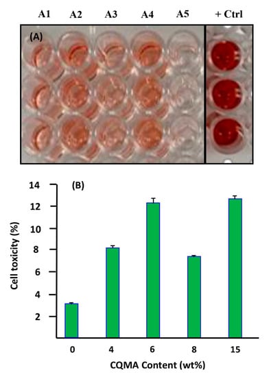 As shown in Figure 13, Ca9-22 cells, when treated with the polymer, presented a low toxicity between 2% and 13%. However, when the cells were treated with the drug carrier systems, an increase in cell cytotoxicity was observed for CQMA-HEMA5 (A1) (8.2 ± 0.2%), CQMA-HEMA7 (A2) (12.28 ± 0.4%), CQMA-HEMA10 (A3) (7.36 ± 0.12%), CQMA-HEMA15 (A4) (12.68 ± 0.27%), CQMA-co-HEMA15 (A5) and 3.07 ± 0.10% for the virgin PHEMA used as the reference. The increase in cell cytotoxicity was due to the effect of HCQ released as an anti-oral cancer agent (Figure 14).