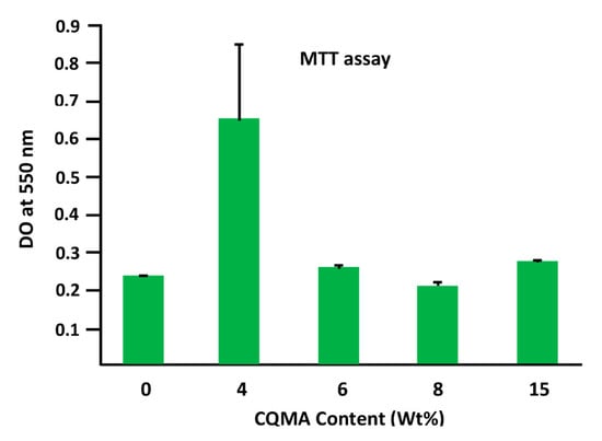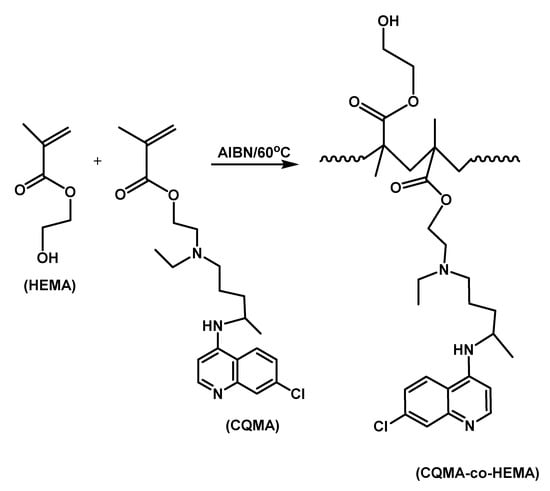 The new synthesized monomer and copolymers were characterized by different techniques. The FTIR spectra of the samples were recorded on a Nicolet iS10 spectrometer (Thermo Scientific, Madison, WI, USA), equipped with an attenuated total reflection (ATR; diamond crystal) accessory. Spectra were obtained over a region of 4000–500 cm−1 at room temperature and acquired with a total of 32 scans per spectrum and resolution of 2 cm−1. The 1H NMR and 13C NMR spectra of samples were taken at 400 and 100 MHz, respectively, on a spectrometer (JEOL Resonance, JEOL, Tokyo, Japan) using deuterated dimethyl sulfoxide (DMSO-d6) as a solvent. The DSC thermograms were traced by a Shimadzu DSC 60A (Kyoto, Japan) system previously calibrated with indium. In total, 8–10 mg of monomer and copolymer powders was packed in aluminum DSC pans before being placed in a DSC cell, then heated under nitrogen gas from 30 to 200 °C at a heating rate of 20 °C·min−1. Data were collected from the second scan run for all samples. No degradation phenomena of HCQ, CQMA and CQMA-co-HEMA samples were observed in all DSC thermograms in the investigated temperature range, noting that the Tg value was estimated as the midpoint of the heat capacity change with temperature and the Tm at the top of the melting peak. X-ray diffraction of pure HCQ and CQMA microparticles and copolymers was recorded by (Rigaku Dmax 2000, The Woodlands, TX, USA) diffractometer using an anode tube of Cu working with voltage of 40 KV and a generator current of 100 mA.