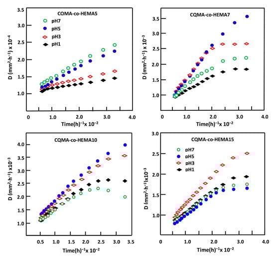where l is the film thickness, and are as defined previously. The D value is determined when the permanent regime of the release process is reached and the HCQ particles deposited on the surface of the material are totally washed. Under such conditions, the profile of the D curve as a function of time would be significant and accurately reflect the dynamic of the drug released into the aqueous solution inside the carrier material. Figure 16 indicates, for all samples, the variation of D as a function of the reverse of time plotted from the data of Figure 15 and Equation (4). The profiles of the curves obtained clearly showed two types of diffusion which occurred during the HCQ release process. The first one was rapid, which took place during the first hours of the process, mainly due to a detachment and a leaching of HCQ particles from the surface of the sample; the second, which was long, described a straight line indicating an establishment of a permanent regime. This indicated that the HCQ diffusion process through CQMA-co-HEMA materials obeyed a Fickian model and also indicated that the release dynamics of this drug from these hybrid materials were mainly governed by a diffusion mechanism through the copolymer matrix. Under these conditions, the steady state of the liberation process was reached and it was possible to build our investigation on the second zone of the liberation process in which the steady state was reached.